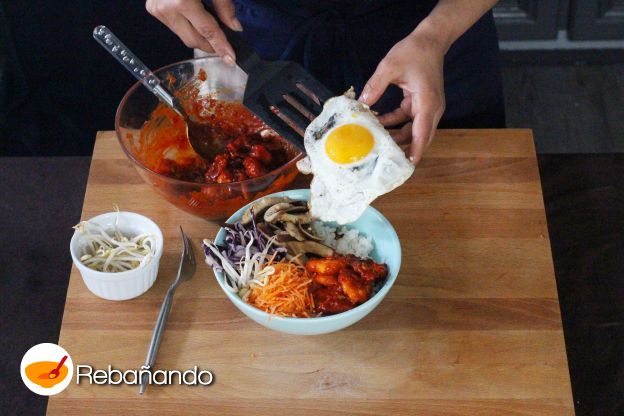Escápate a Corea con este delicioso Bibimbap de gambas, setas y vegetales