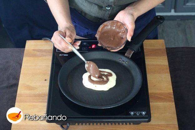 Echamos la mitad de un cucharón de masa y utilizamos el mismo dorso del cucharón para darle una forma redondeada. Añadimos una cucharada de Nutella sobre la masa.