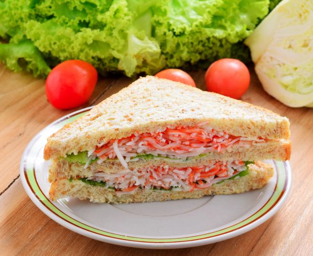 Una idea de sándwich muy veraniega: mezclaremos palitos de cangrejo con tiras de verduras y mayonesa y, con esta mezcla, untaremos el pan de molde. Añadiremos unas hojas de lechuga, una rodaja de tomate y estará listo para comer.