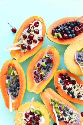 Navega a una isla tropical con estos riquísimos botecitos de postre. La idea es que te ahorres tiempo de lavar la vajilla, ¡usando la papaya como plato! Córtala por la mitad, sácale las semillas y rellénala con todos los ingredientes que te provoquen: fruta, yogur, helado, almendras, miel... ¡puedes combinarlos como sea para crear un postre saludable, fresco y muy dulce!