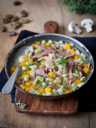 En un sartén, coloca una cucharada de aceite y sofríe los chalotes y los champiñones y deja cocer hasta que el agua de los champiñones se evapore por completo. Aparte, sofríe el tocino, luego agrega las habas, las castañas y el caldo. Cuece a fuego bajo durante 10 min. Agrega las verduras y sirve bien caliente.