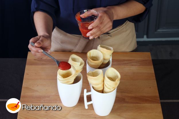 Una vez listos tus conos de masa de pizza, colócalos en unas tazas que te servirán de soporte, asegúrate de que estén hechos de un material que puedas meter al horno.