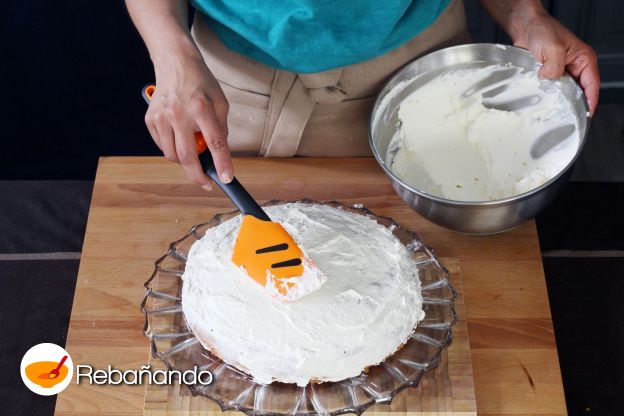 Colocar 3/4 de la crema sobre el pastel para cubrirlo.