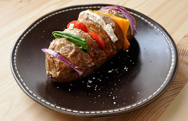 Pasado el tiempo de horneado, saca las patatas del horno y coloca cada ingrediente en una incisión alternándolos para que quede colorido.