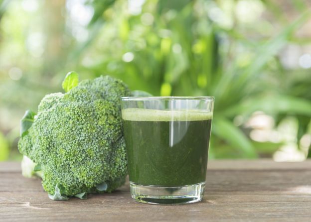 Los jugos verdes aportan una cantidad importante de nutrientes y de fibra. Prepara uno con ramilletes de brócoli, 2 plátanos, jugo de naranja, hojitas de menta y un poquito de agua.