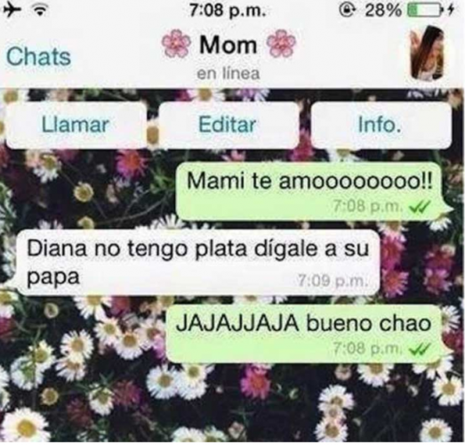 Conversaciones de WHATSAPP entre MADRES E HIJAS, ¡morirás de risa! DeDana Elfenbaum, 07/06/2017 Rebañando compartidos Compartir en Facebook Twitear Pin it Share on WhatsApp Compartir 5/8 Vista previa Siguiente ella lo tiene claro ¡ENORME LA MAMÁ!