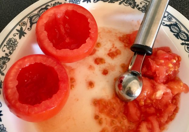 Precalienta el horno a 180° C. Lava los tomates, corta la parte superior y retira la pulpa con ayuda de una cuchara. A continuación, coloca papel encerado al fondo de un molde y pon ahí los tomates. Pinta el exterior con un poco de mantequilla derretida o aceite de oliva para que se doren.