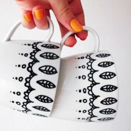 Los marcadores para porcelana los encuentras fácilmente en las tiendas de manualidades. Inventa tu diseño sobre papel y luego trázalo sobre las tazas.