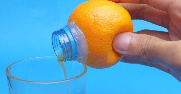 Corta una boca de botella de plástico, con cuello, e introdúcela en el huevo de la fruta. Sela los bordes con silicón caliente y cierra la tapa.
