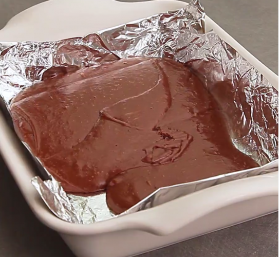 Coloca la mitad de la mezcla en un recipiente rectangular para el horno cubierto con papel para hornear.