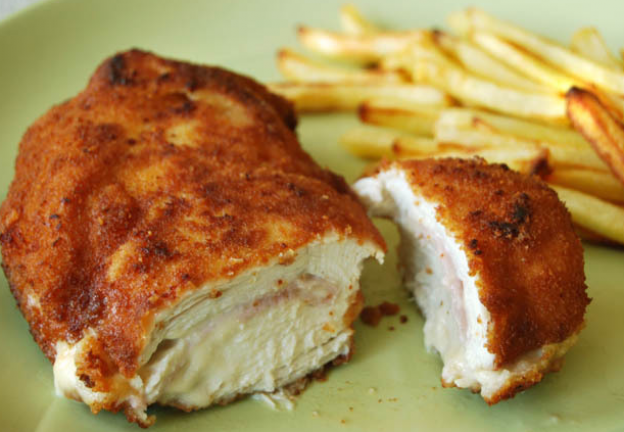 Simplemente, una pechuga de pollo rellena de jamón york y queso y... ¡rebozada! ¡Mira qué fácil