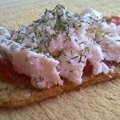Tosta de pan integral con confitura de tomate y sobre la confitura lleva desmigado queso de cabra de rulo