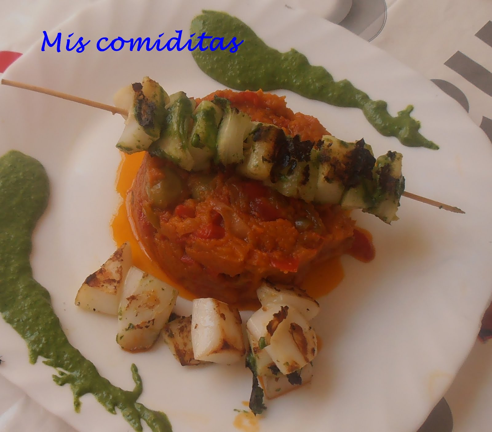 Brocheta de sepia con ensalada de calabaza