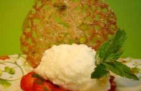Mousse de chocolate blanco sobre un carpaccio de fresas y menta