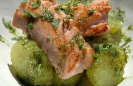 Ensalada de patata caliente, vinagreta de acedera y salmón braseado