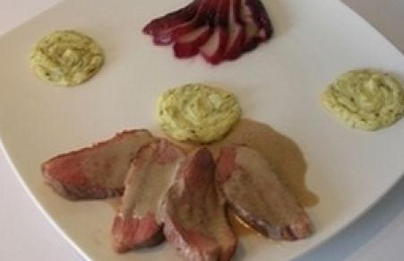 Magret de pato, peras al vino tinto y salsa de Roquefort