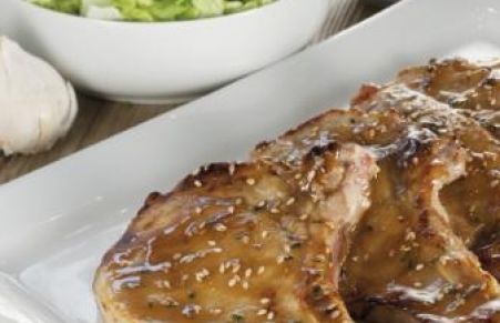 Chuletas de cerdo marinadas en mostaza con miel y sésamo