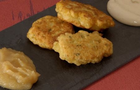 Buñuelos de bacalao acompañado de dos salsas diferentes: un alioli de manzana y un puré de manzana reineta.