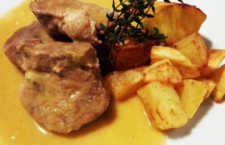 Carrilleras ibéricas a la vainilla con patatas y piña
