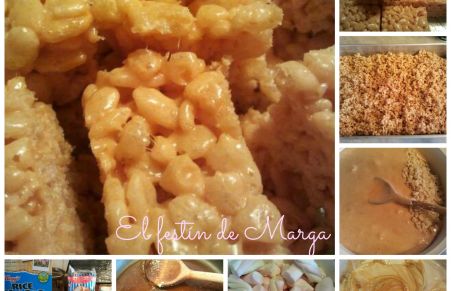 Tenía muchas ganas de hacer barritas de cereales de arroz inflado. Cuando era una niña, mi primo, que vivía en Nueva York y pasaba los veranos con nosotros, me enseñó a hacerlas. Me pareció algo como mágico. Cogió una bolsa de marshmallows (que traía él, porque en España no había) y un paquete de arroz inflado, lo puso en un cazo al fuego y, de repente, tenía una masa informe, crujiente y riquísima.