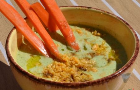 Hace unos días me pasaron esta receta, que creo encontraron en la Web, y que, además de fresquita, resulta muy nutritiva. Se trata de un gazpacho cuyo elemento principal es la lechuga, pero que lleva yogur y huevo, además de los aderezos típicos de este plato: vinagre (en este caso balsámico), aceite (muy poquito) y sal. En la receta que me dieron el huevo cocido se trituraba entero, pero yo he apartado la yema para ponerla rallada como guarnición. Lo de acompañar con crudités (en mi caso de zanahorias) no me lo dijeron, pero le va muy bien.