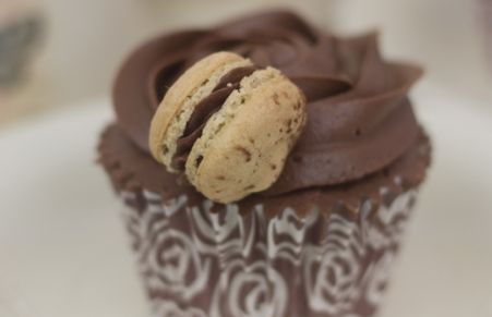 Cupcakes de chocolate y café con macarons de café y chocolate