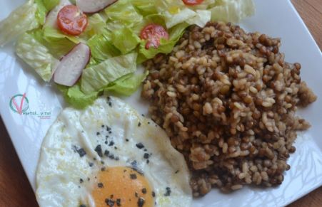 La mujaddara puede ser plato único, pero también funciona muy bien como guarnición o parte de un plato único, como el que he preparado para la foto con un poco de ensalada y un huevo con ajo en polvo y sal negra.