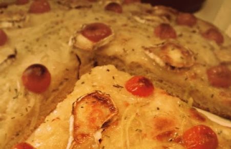 Focaccia de cebolla, tomates cherry y queso de cabra