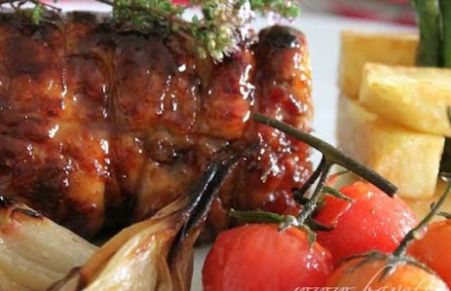 Un ezquisito pollo laqueado con miel y relleno de jamón dulce.