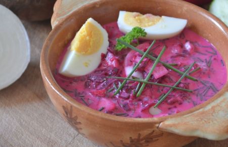 Como no podría ser de otra manera, al ser un plato popular y de larga tradición, existen muchas versiones. La que presento es una versión sencilla que trata de ser lo más fiel a las raíces de este plato. Mi intención es que llevara eneldo fresco, pero no ha sido posible encontrarlo y lo he sustituido por cebollino fresco y un poco de perejil rizado. Tampoco he encontrado remolacha tierna, con sus hojas y todo, que es lo que suelen usar en Polonia para hacer este plato. He recurrido a la remolacha que recibo con mi verdura ecológica, que la he cocido al vapor (20 minutos en olla a presión) y la he pelado. Como verduras crudas he usado pepino, rabanito y cebolla tierna (se podría haber usado otras como pimiento, zanahoria...) y el yogur utilizado ha sido de tipo griego (por supuesto, sin azúcar). Hay quien adereza con aceite de oliva y con otras hierbas (le va muy bien, según me cuenta mi sobrina, el orégano), pero yo no he usado más que pimienta negra molida, además de las citadas hierbas frescas. También hay quien le añade ajo, que yo he omitido. He visto que este plato se suele acompañar con huevo duro y, también, con patatas cocidas. Yo he recurrido al primero de ellos. El agua fría se puede sustituir por caldo de cocer la remolacha, siempre frío.