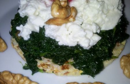 Espinacas con requesón y nueces en cama de tortitas de maíz y soja