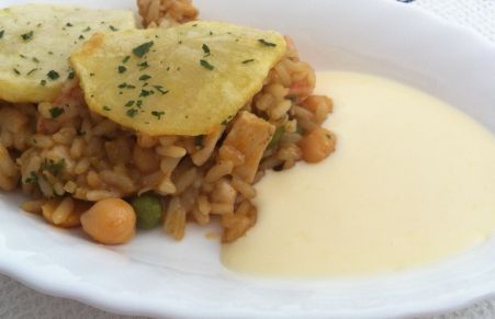 Una paella muy completa con arroz y garbanzos acompañada de patatas fritas a rodajas y alioli.