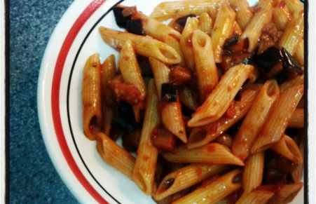 Penne rigate con salsa de berenjena al vino tinto