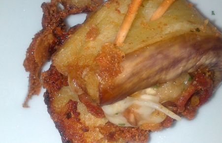 Es un sencillo rollito de berenjena con beicon y mozzarela.