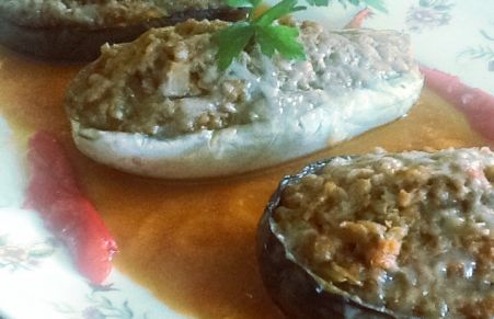 Berenjenas multicolor con atún con salsa de pimientos y tomate
