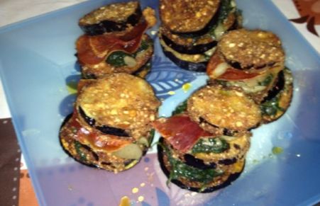 Crujiente bocado de berenjenas rebozadas con miel y cacahuetes machacados montado sobre espincas y champiñones al ajillo.