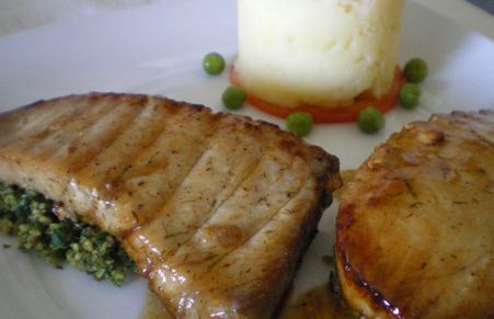 Atún marinado en miel y estragón sobre lecho de perejil almendrado