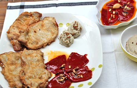 Medallones de lomo de cerdo rellenos de paté de berenjena y pimientos del piquillo caramelizados