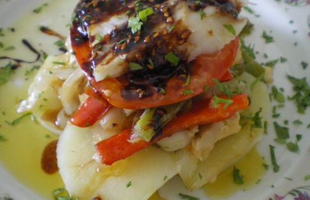 Una forma diferente de disfrutar del bacalao en una ensalada con verduras caramelizadas y base de patatas cocidas y rodajas de tomates frescos, todo ello regado con una exquisíta vinagreta caramelizada con miel y sésamo.