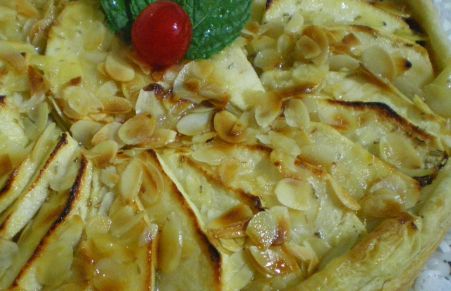 Sorprende a tu familia o amigos con esta merienda casera; tarta de manzana.Un dulce casero irresistible.Las manzanas están aderezadas con limón y romero, lo cuál hace en el paladar un contraste con el dulzor y aroma a canela de la crema pastelera y las pasas emborrachadas en brandy.Merece la pena probarla porque es una receta bastante fácil de elaborar.
