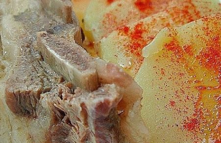 Receta típica gallega, a base de carne cocida con patatas. Entre otras viandas, este plato forma parte del menú en las fiestas de Lugo por San Froilán. Es una receta sin complicaciones, con pocos ingredientes, sencilla de preparar, y con un resultado para mi gusto riquisimo, gracias al unto y al pimentón, que le pone al plato un sabor especial. Y claro está, con ayuda también de buena matería prima, como es la carne de ternera gallega y nuestras patatas.