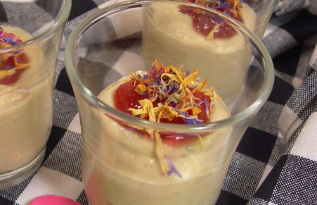 Vasitos de berenjena ahumada con romero, mermelada de pimiento rojo y pétalos de flores