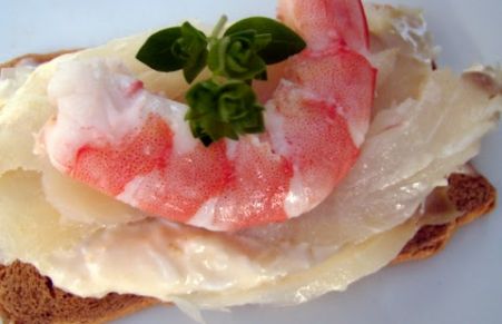 Tostas cremosas de bacalao y langostinos