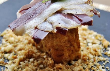La tierra está hecha con unas migas de pan con ajo, el tallo es una torrija de setas y la corona es una espiral de jamón de pato.