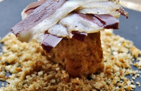 La tierra está hecha con unas migas de pan con ajo, el tallo es una torrija de setas y la corona es una espiral de jamón de pato.