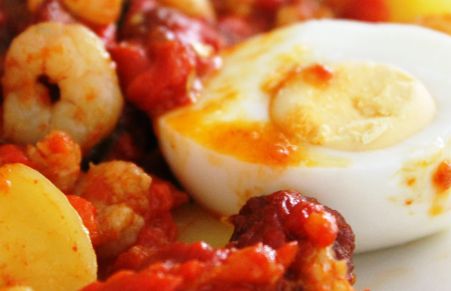 Ensalada de pimientos asados, patatas y gambas al ajillo