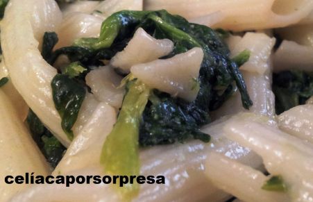 En casa nos encantan las espinacas, así que otra opción para comerlas es acompañando a la pasta. Si elegís un buen queso fuerte como toque final, la combinación os quedará ideal. Apto para celíacos.