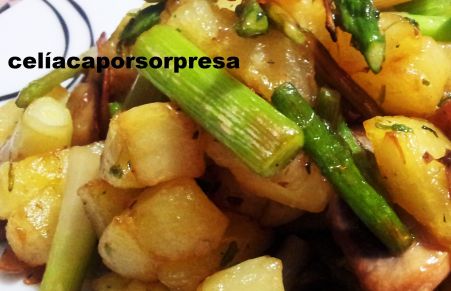 Salteado de patatas, ajetes, champiñón y espárragos trigueros