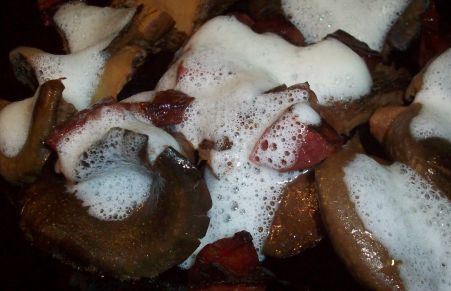 Uno de los hongos más valorados en esta época, el NÍSCALO o ROVELLÓN, cocinado a la plancha. Toda la vida los había consumido en salsa o asados con tacos de jamón y trocitos de ajo picado, asi que me propuse darles un toque diferente y así además tener una nueva opción a la hora de comerlos. En lugar del típico jamón en tacos hemos añadido un jugoso salchichón de venao al cabrales, que añade un punto graso y de sabor más potente a los mismos, y en lugar del ajo laminado, he preparado un suave aire de ajo morado sobre los mismos. Pura delicia.