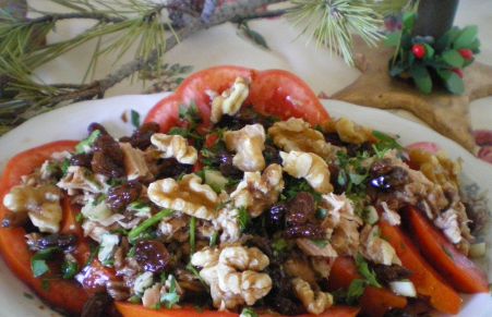Una deliciosa ensalada de tomates aderezada con una vinagreta caramelizada de vino dulce y salteada con pasas maceradas en el vino y nueces.Una combinación exquisita y festiva para tomar como entrante o guarnición de otros platos, fácil de preparar y bastante asequible.